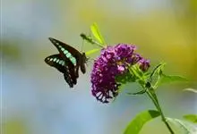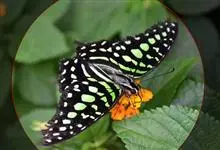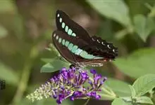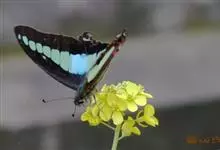 青带凤蝶Graphium sarpedon ,又名青凤蝶,是最普遍的中型凤蝶,飞行速度很快。青带凤蝶的翅膀中央有许多浅蓝色的斑点,很整齐地排列成一条直线。这些斑点由上而下逐渐变大,就像一条青色的带子。全部>>
