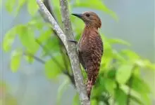 栗啄木鸟:是一种红褐色啄木鸟,体长21厘米。雄性成鸟整个头棕色,但稍淡;眼下有一宽阔血红色纵纹;翕部深棕色,背、腰、尾上覆羽、尾羽也是深棕色;除尾羽外,各羽均具黑色横斑;尾羽则具黑色点斑;翼也是深棕色,…全部>>
