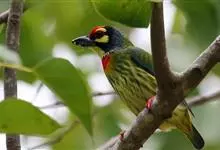 金喉拟啄木鸟,是须鴷科、拟啄木鸟属的鸟类。金喉拟啄木鸟为小型鸟类,体长19-24厘米。额深红色,头顶金黄色,后枕具一大块深红色斑,耳羽和头侧银灰色,上体草绿色,颏和上喉金黄色,下喉淡银灰色,…全部>>