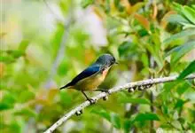 黄腹啄花鸟:体重11-16克,体长104-117毫米。是一种体型大,下腹部为艳黄色的啄花鸟,雄鸟特征为头黑色,喉部有白色纵斑、喉侧及上体成对比,两翅和尾黑色,外侧尾羽内翈具白色斑块。其余下体淡黄色。…全部>>