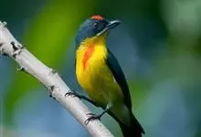 红胸啄花鸟:体重5-10克,体长60-92毫米。体形纤小。雄鸟上体呈辉亮的金属绿色;下体棕黄,胸部具一朱红色块斑,极易与其他啄花鸟区别。雌鸟上体呈橄榄绿,下体棕黄色。虹膜褐色,嘴褐黑色或角灰色,…全部>>