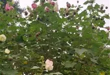 木芙蓉,锦葵科木槿属落叶灌木或小乔木。小枝上有细绒毛;叶片为卵状心形,托叶为披针形,常早落;花单生,花萼为钟形,花冠初为白色或淡红色,后逐渐变为深红色;果实为扁球形,有淡黄色的毛附着。花期8到10月。…全部>>