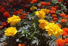 万寿菊是菊科万寿菊属一年生草本植物,别名孔雀菊、缎子花、臭菊花、西番菊、红黄草、小万寿菊、臭芙蓉、孔雀草。万寿菊茎近基部分枝。叶羽状分裂,长5-10厘米,宽4-8厘米,裂片长椭圆形或披针形,具锐齿,…全部>>