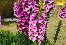 毛地黄是车前科、毛地黄属一年生或多年生草本植物。株高0.5—1米,茎直立,少分枝,全株被灰白色短柔毛和腺毛叶基生,呈莲座状,卵圆形或卵状披针形。顶生总状花序,花冠钟状,紫红色,内面有浅白斑点。菊果卵形。…全部>>