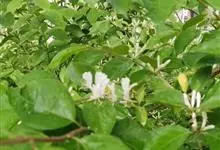 山银花在华南地区野外山林生长。木质藤本,长2~5m。树皮黄褐色渐次变为白色,嫩时有短柔毛。叶对生,卵圆形至椭圆形,长4~8cm,宽3.5~5cm,上面绿色,主脉上有短疏毛,下面带灰白色,密生白色短柔…全部>>