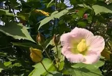 木芙蓉,锦葵科木槿属落叶灌木或小乔木。小枝上有细绒毛;叶片为卵状心形,托叶为披针形,常早落;花单生,花萼为钟形,花冠初为白色或淡红色,后逐渐变为深红色;果实为扁球形,有淡黄色的毛附着。花期8到10月。…全部>>