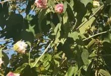 木芙蓉,锦葵科木槿属落叶灌木或小乔木。小枝上有细绒毛;叶片为卵状心形,托叶为披针形,常早落;花单生,花萼为钟形,花冠初为白色或淡红色,后逐渐变为深红色;果实为扁球形,有淡黄色的毛附着。花期8到10月。…全部>>