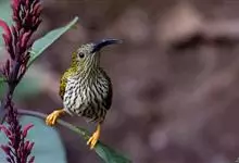 纹背捕蛛鸟:为太阳鸟科捕蛛鸟属的鸟类。是太阳鸟科中体型较大的一种,体重25-45克,体长160-210毫米。嘴粗长而尖且向下弯曲。上体橄榄黄色具黑色中央斑纹。下体淡黄白色满布黑色纵纹,尾具黑色次端斑。…全部>>