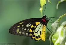 金裳凤蝶是凤蝶科、裳凤蝶属的动物。金裳凤蝶身体呈黑色,头、颈和胸侧有红毛,腹部有黑黄两色相间条纹,雄蝶前翅黑色,具黑天鹅绒光泽,各脉两侧灰白色,后翅金黄色,各室外缘有等腰三角形黑斑1枚,斑内侧有晕,…全部>>