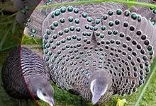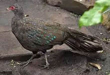 灰孔雀雉:雄鸟体长50-67厘米,体重456-710克;雌鸟体长33-52厘米,体重460-500克。雄鸟全身羽毛黑褐色,…全部>>