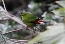 火尾绿鹛是莺科、绿鹛属小型鸟类,体长11-14厘米。上体绿色,头顶至枕具黑色鳞状斑,眼先和眼后黑色,眉纹黄绿色。两翅黑色具黄色和红色翅斑及白色端斑,极为醒目。中央一对尾羽绿色,外侧尾羽鲜红色。…全部>>