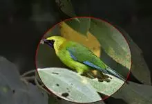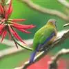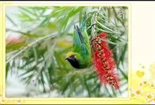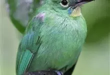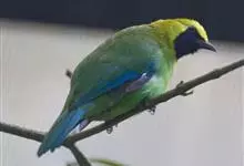 蓝翅叶鹎:小型鸟类,体长15-18厘米。雄鸟通体草绿色,尾蓝绿色,肩和翅亮蓝 色,胸缀有黄色,颏、喉黑色。雌鸟颏,喉蓝绿色。栖息在海拔1500米以下的常绿阔叶林、次生林和林缘疏林灌丛中。…全部>>
