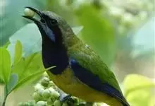 橙腹叶鹎体形大小和金额叶鹎相似,体长16~20厘米。额至后颈黄绿色,其余上体绿色,小覆羽亮钴蓝色,形成明显的肩斑。颏、喉、上胸黑色具钴蓝色髭纹,其余下体橙色。飞羽和尾羽雄鸟黑色、雌鸟绿色。…全部>>