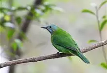 蓝翅叶鹎:小型鸟类,体长15-18厘米。雄鸟通体草绿色,尾蓝绿色,肩和翅亮蓝 色,胸缀有黄色,颏、喉黑色。雌鸟颏,喉蓝绿色。栖息在海拔1500米以下的常绿阔叶林、次生林和林缘疏林灌丛中。…全部>>