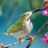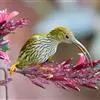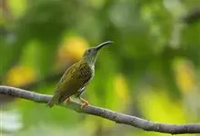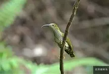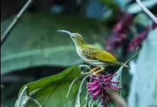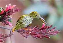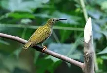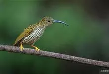 纹背捕蛛鸟:为太阳鸟科捕蛛鸟属的鸟类。是太阳鸟科中体型较大的一种,体重25-45克,体长160-210毫米。嘴粗长而尖且向下弯曲。上体橄榄黄色具黑色中央斑纹。下体淡黄白色满布黑色纵纹,尾具黑色次端斑。…全部>>