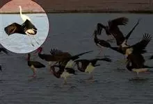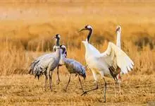 丹顶鹤:是鹤科、鹤属的一种大型涉禽,体长120-160厘米。颈、脚较长,通体大多白色,头顶鲜红色,喉和颈黑色,耳至头枕白色,脚黑色,站立时颈、尾部飞羽和脚黑色,头顶红色,…全部>>