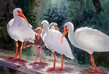 美洲白鹮:是一种大型涉禽。体长56-58厘米,体重750-1050克。头和颈裸出,喙很长,向下弯曲。飞行时颈和脚伸直,交替地拍动翅膀和滑翔。成年美洲白鹮,除了嘴和腿部是橘红色,翅膀末端有黑色外,…全部>>