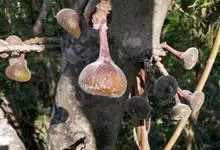 大果榕是桑科榕属的小乔木,株高可达10米;幼枝被柔毛;叶互生,宽卵状心形或近圆形;雄花无梗、匙形、花丝长,雌花生于雌株榕果内,子房白色;榕果簇生于树干基部或老茎短枝上、扁球形或陀螺形,…全部>>