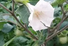 曼陀罗,茄科曼陀罗属一年生大型草本植物,全株光滑。有臭气;叶呈广卯形,边缘具不规则波状浅齿裂;花单生于枝杖间或叶腋,直立,有短梗;花萼是筒状裂片三角形,颜色为白色或淡紫色;果实为蒴果卵状,…全部>>
