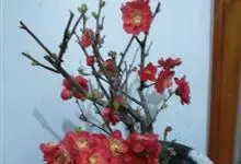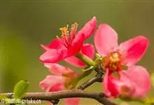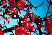 贴梗海棠Nakai)是蔷薇科、木瓜海棠属植物。落叶灌木,高达2米,枝条直立开展,有刺。叶片卵形至椭圆形,稀长椭圆形,长3-9厘米,宽1.5-5厘米。花先叶开放,3-5朵簇生于二年生老枝上。…全部>>