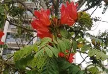 火焰树是紫葳科、火焰树属乔木,树皮平滑,灰褐色。奇数羽状复叶,对生,连叶柄长达45厘米;小叶13-17枚,叶片椭圆形至倒卵形,伞房状总状花序,顶生,密集;被褐色微柔毛,具有明显的皮孔;花冠一侧膨大,…全部>>