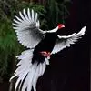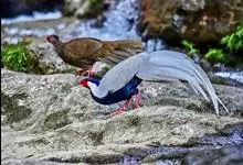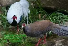 白鹇,是鸡形目雉科鹇属的一种留鸟。雄鸟上体白色并具黑色纹,下体黑色,头顶具黑色长羽冠,尾白而长;雌鸟体型较小,以橄榄褐色为主,下体具白色或皮黄色细纹;虹膜褐色,眼周具红色裸皮,喙黄色,脚鲜红色。…全部>>