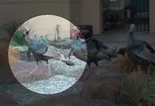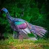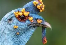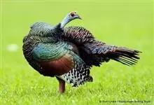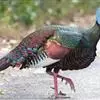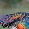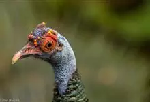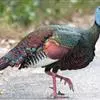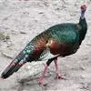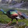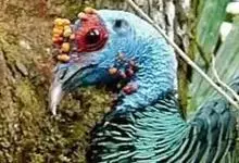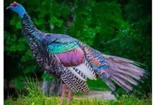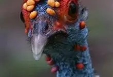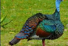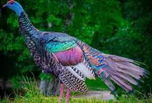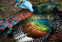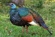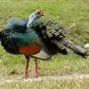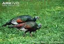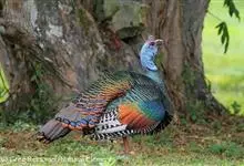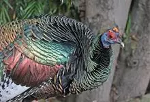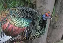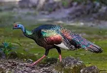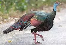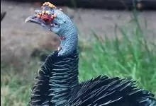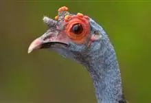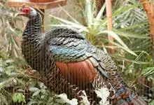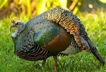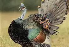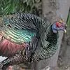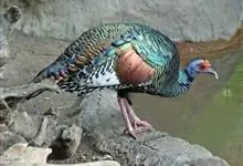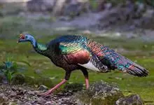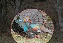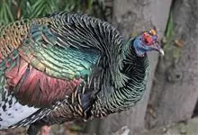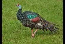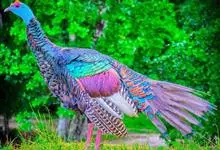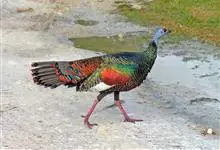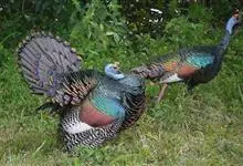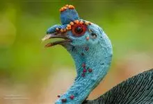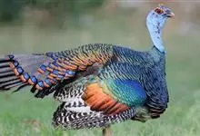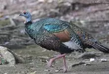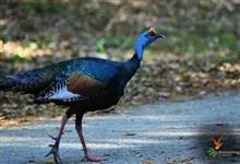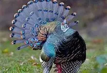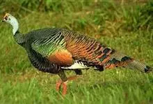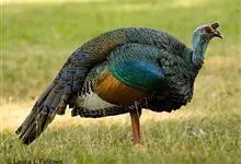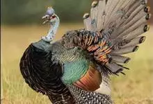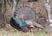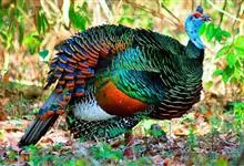 眼斑吐绶鸡:是火鸡科的两种鸟类之一。体型比普通火鸡略小些,体长1米左右,体重2.4-5.4千克,雄性比雌性略大,长得很特别,蓝色的秃脑袋上冒出几个橙黄色的疙瘩。但是它羽色艳丽,身体呈铜色及绿色。…全部>>