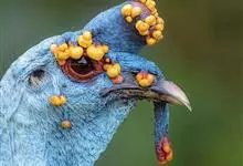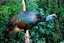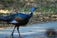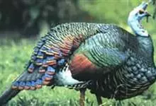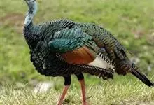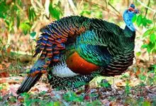 眼斑吐绶鸡:是火鸡科的两种鸟类之一。体型比普通火鸡略小些,体长1米左右,体重2.4-5.4千克,雄性比雌性略大,长得很特别,蓝色的秃脑袋上冒出几个橙黄色的疙瘩。但是它羽色艳丽,身体呈铜色及绿色。…全部>>