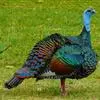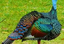 眼斑吐绶鸡:是火鸡科的两种鸟类之一。体型比普通火鸡略小些,体长1米左右,体重2.4-5.4千克,雄性比雌性略大,长得很特别,蓝色的秃脑袋上冒出几个橙黄色的疙瘩。但是它羽色艳丽,身体呈铜色及绿色。…全部>>