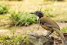 栗颈噪鹛是噪眉科、噪鹛属中型鸟类,体长22-25厘米。头顶至枕暗石板灰色,前额、头侧、颏、喉至上胸黑色,耳后至颈侧有一栗棕色块斑,在头后颈侧极为醒目。上体暗橄榄褐色,两翅黑褐色,初级飞羽外翈沾灰。…全部>>