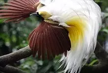 大极乐鸟是极乐鸟属中最大的鸟种。成年雄鸟体长可达到43厘米,雌性可达35厘米。雄鸟的额、颊、喉等墨绿色;头、颈黄色;上体暗赤栗色;腹部葡萄红色,胁部有长饰羽,其基部橙黄,中部黄色,…全部>>