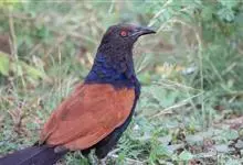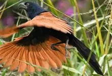 褐翅鸦鹃,是鹃形目鸦鹃科鸦鹃属的鸟类。褐翅鸦鹃的身体为黑色;头颈和胸带蓝紫色金属光泽并具黑亮的羽干纹,下胸至腹部泛金属绿光泽;两翼和肩部为棕栗色,外侧飞羽具暗色羽端,尾羽闪铜绿色光泽;虹膜赤红色,…全部>>