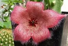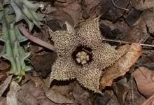 巨花犀角又称大豹皮花,是夹竹桃科犀角属的一种植物。茎粗,花大,边缘生长细毛。植株柱形多分枝呈丛生,柱形具4棱,棱缘具细小疣突。花大,五角星形黄色,并有横向棕褐色斑纹,似豹皮而得名。花期夏秋两季。…全部>>
