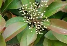 石楠 Kalkman),是蔷薇科石楠属的常绿乔木,高5~12米,株型紧凑,树冠圆球形。树枝为褐灰色;鳞片为褐色,没有毛;叶片革质,长椭圆至侧卵状椭圆形,有锯齿,新叶红色光亮。复伞房花序,白色小花,…全部>>