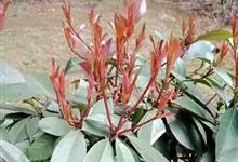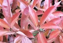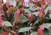红叶石楠 是蔷薇科,石楠属杂交种,为常绿小乔木或灌木,乔木高可达5米、灌木高可达2米。叶片革质,长圆形至倒卵状、披针形,叶端渐尖,叶基楔形,叶缘有带腺的锯齿,花多而密,复伞房花序,花白色,梨果黄红色,…全部>>