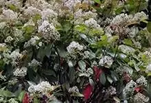 石楠 Kalkman),是蔷薇科石楠属的常绿乔木,高5~12米,株型紧凑,树冠圆球形。树枝为褐灰色;鳞片为褐色,没有毛;叶片革质,长椭圆至侧卵状椭圆形,有锯齿,新叶红色光亮。复伞房花序,白色小花,…全部>>