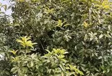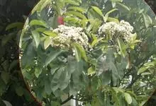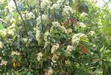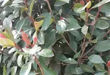 石楠 Kalkman),是蔷薇科石楠属的常绿乔木,高5~12米,株型紧凑,树冠圆球形。树枝为褐灰色;鳞片为褐色,没有毛;叶片革质,长椭圆至侧卵状椭圆形,有锯齿,新叶红色光亮。复伞房花序,白色小花,…全部>>