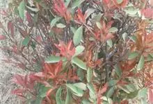 红叶石楠 是蔷薇科,石楠属杂交种,为常绿小乔木或灌木,乔木高可达5米、灌木高可达2米。叶片革质,长圆形至倒卵状、披针形,叶端渐尖,叶基楔形,叶缘有带腺的锯齿,花多而密,复伞房花序,花白色,梨果黄红色,…全部>>