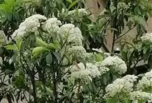 石楠 Kalkman),是蔷薇科石楠属的常绿乔木,高5~12米,株型紧凑,树冠圆球形。树枝为褐灰色;鳞片为褐色,没有毛;叶片革质,长椭圆至侧卵状椭圆形,有锯齿,新叶红色光亮。复伞房花序,白色小花,…全部>>