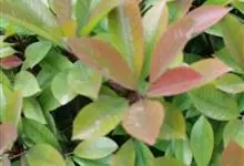 红叶石楠 是蔷薇科,石楠属杂交种,为常绿小乔木或灌木,乔木高可达5米、灌木高可达2米。叶片革质,长圆形至倒卵状、披针形,叶端渐尖,叶基楔形,叶缘有带腺的锯齿,花多而密,复伞房花序,花白色,梨果黄红色,…全部>>