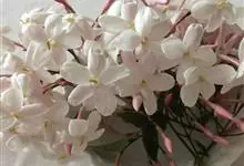 素馨花,木犀科素馨属多年生的攀援灌木植物。攀援灌木,小枝圆柱形,具棱或沟;叶对生,叶轴常具窄翼,小叶片卵形或长卵形;聚伞花序顶生或腋生,花序梗长,苞片线形,花萼无毛,裂片锥状线形,花冠白色,…全部>>