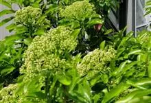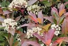 石楠 Kalkman),是蔷薇科石楠属的常绿乔木,高5~12米,株型紧凑,树冠圆球形。树枝为褐灰色;鳞片为褐色,没有毛;叶片革质,长椭圆至侧卵状椭圆形,有锯齿,新叶红色光亮。复伞房花序,白色小花,…全部>>