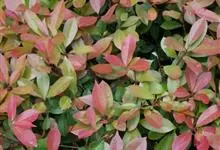 红叶石楠 是蔷薇科,石楠属杂交种,为常绿小乔木或灌木,乔木高可达5米、灌木高可达2米。叶片革质,长圆形至倒卵状、披针形,叶端渐尖,叶基楔形,叶缘有带腺的锯齿,花多而密,复伞房花序,花白色,梨果黄红色,…全部>>