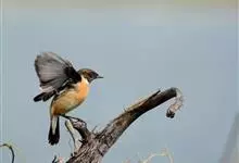 黑喉石鵖,雀形目鹟科石鵖属小型鸣禽,俗名谷尾鸟、黑喉石。其体色为黑褐色。雄鸟头部、背部、两翼及尾黑色,颈侧及翼上具白斑,胸部和腹侧红棕色,腰及尾下覆羽白色。雌鸟体色为褐色,上体具深色纵纹,胸部染棕色,…全部>>