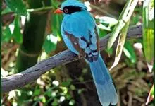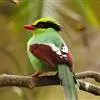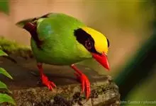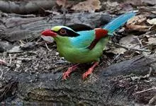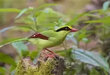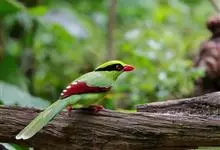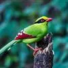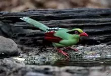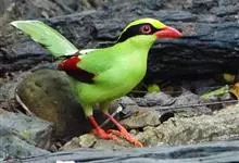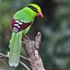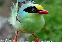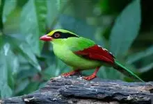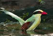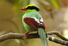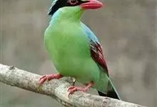 蓝绿鹊:中型鸟类,共有5个亚种。体长36-38厘米。尾长,嘴、脚红色。通体羽色主要为草绿色,宽阔的黑色贯眼纹向后延伸到后颈,在绿色的头侧极为醒目。两翅栗红色,内侧飞羽具黑色次端斑和白色尖端。尾绿色,…全部>>