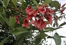 翅果刺桐 Merr.)是豆科,刺桐属乔木,高12-15米,具粗壮的刺。羽状复叶具3小叶,小叶膜质,卵状三角形,先端短渐尖,基部圆或宽楔形,两面无毛;总状花序长7-10厘米,有褐色绒毛;花红色,花萼钟状,…全部>>