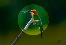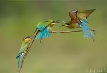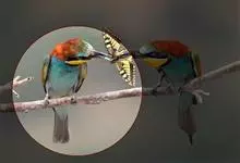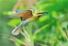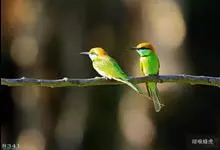 栗喉蜂虎是蜂虎科蜂虎属的鸟类。有热带鸟类羽毛艳丽的特征:喉部是栗红色的,黑色的过眼纹,翅膀和背部是绿色的,尾翼是蓝色的,飞行时翅膀下面的羽毛是橙黄色的,在阳光的照射下,它们全身闪烁着金属般的艳丽光泽,…全部>>