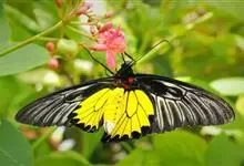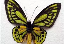 金裳凤蝶是凤蝶科、裳凤蝶属的动物。金裳凤蝶身体呈黑色,头、颈和胸侧有红毛,腹部有黑黄两色相间条纹,雄蝶前翅黑色,具黑天鹅绒光泽,各脉两侧灰白色,后翅金黄色,各室外缘有等腰三角形黑斑1枚,斑内侧有晕,…全部>>