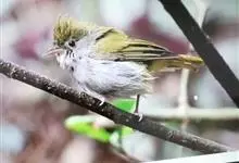 白腹凤鹛是绿鹃科、绿凤鹛属的小型鸟类,体长10-12厘米。上体从头到尾黄绿色,有短的羽冠,头顶微具黑色羽轴纹;眼先、眼周,耳羽和下体灰白色,尾下覆羽黄色。虹膜褐色或红褐色,上嘴浅褐色或肉褐色,…全部>>