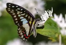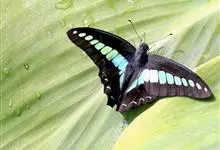 青带凤蝶Graphium sarpedon ,又名青凤蝶,是最普遍的中型凤蝶,飞行速度很快。青带凤蝶的翅膀中央有许多浅蓝色的斑点,很整齐地排列成一条直线。这些斑点由上而下逐渐变大,就像一条青色的带子。全部>>